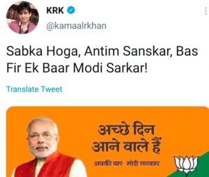 केआरके ने एक और पोस्ट किया जिसमें उन्होंने पीएम मोदी के बैनर वाली एक फोटो शेयर की जिसमें लिखा था- ‘अच्छे दिन आने वाले हैं, अब की बार मोदी सरकार।’ इस पोस्ट पर कैप्शन के साथ एक्टर ने तंज कसते हुए लिखा-सबका होगा अंतिम संस्कार, बस फिर एक बार मोदी सरकार।’